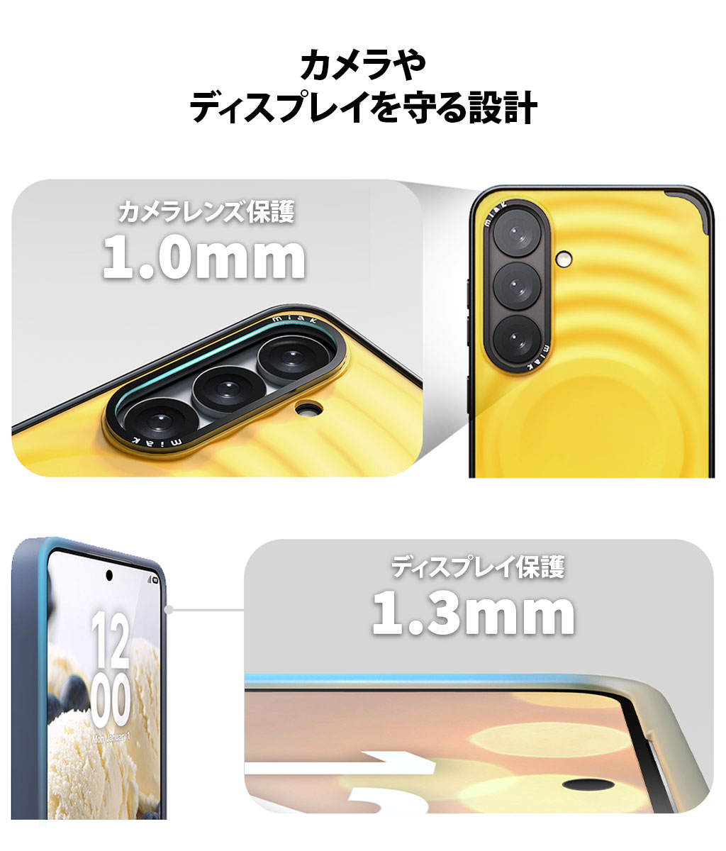 カメラホール部やディスプレイの周囲は端末本体よりわずかに高く設計されています。テーブルに置いてもレンズや画面が接地面に触れにくく、傷を防ぎます。
